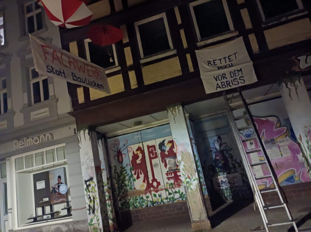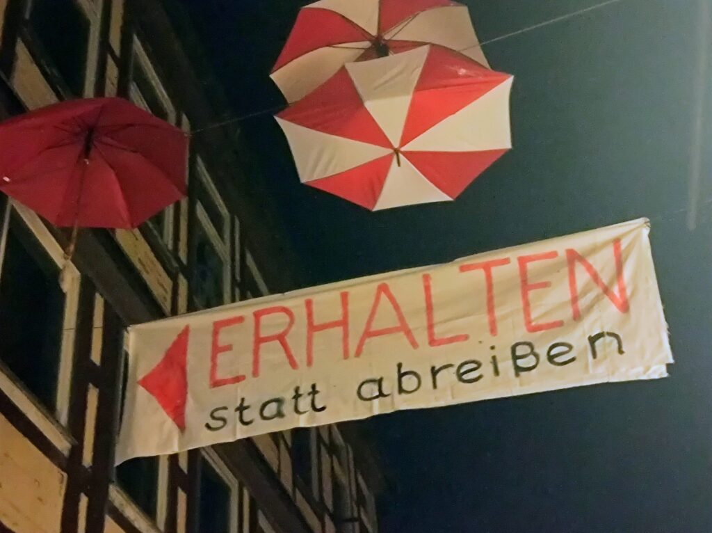 Ein markantes Gebäude in der Burgstraße soll komplett abgerissen werden. Die Fassade prägt das Stadtbild. Statt dessen soll es hier bald eine weitere Baulücke geben. Hunderte Menschen gehen hier täglich entlang. Wir sind für den Erhalt und die Śicherung der Fassade! Die steht dank der Betonsäulen.